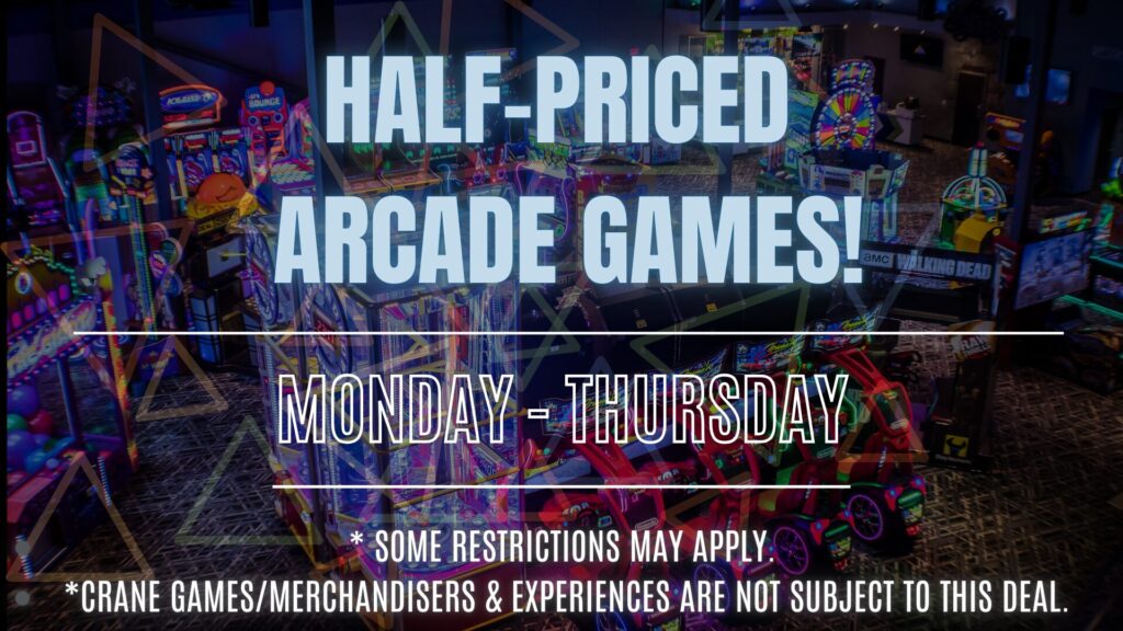 - Enjoy half-priced arcade games Monday through Thursday every week. Come in for some discounted weekday fun!
